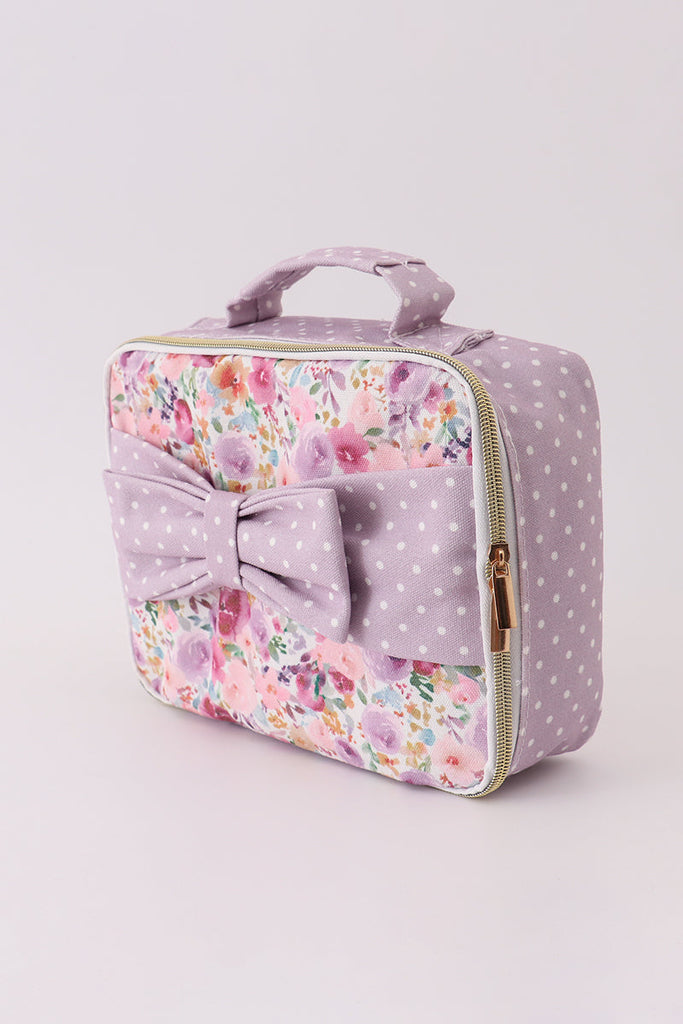 Purple floral print canvas bow lunch bag