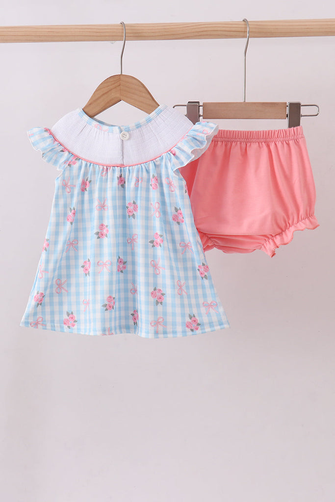 Blue I love DADDY smocked floral gingham ruffle bloomer set