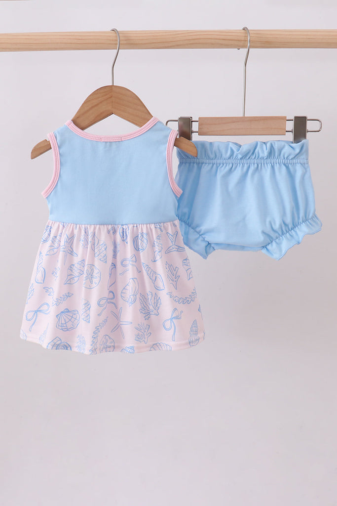 Dive into adorable style with this charming bloomer set featuring a whimsical blue shell and starfish print! Perfect for little ones who love the ocean, this two-piece ensemble combines comfort with cuteness. The sweet bow details add a touch of elegance, while soft, breathable fabric keeps your child happy all day long. Ideal for playdates, beach trips, or everyday wear—because every day deserves a splash of seaside charm!