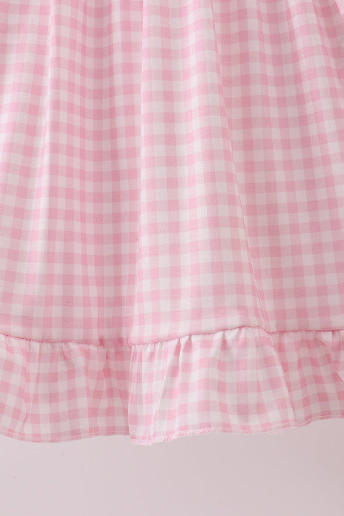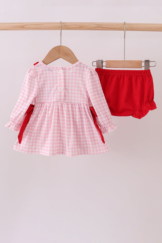 This charming pink gingham bloomer set features delicate bow embroidery and playful ruffle details, perfect for adding a sweet touch to any little one's outfit. Comfortable and adorable, it’s ideal for warm days filled with fun and adventures.