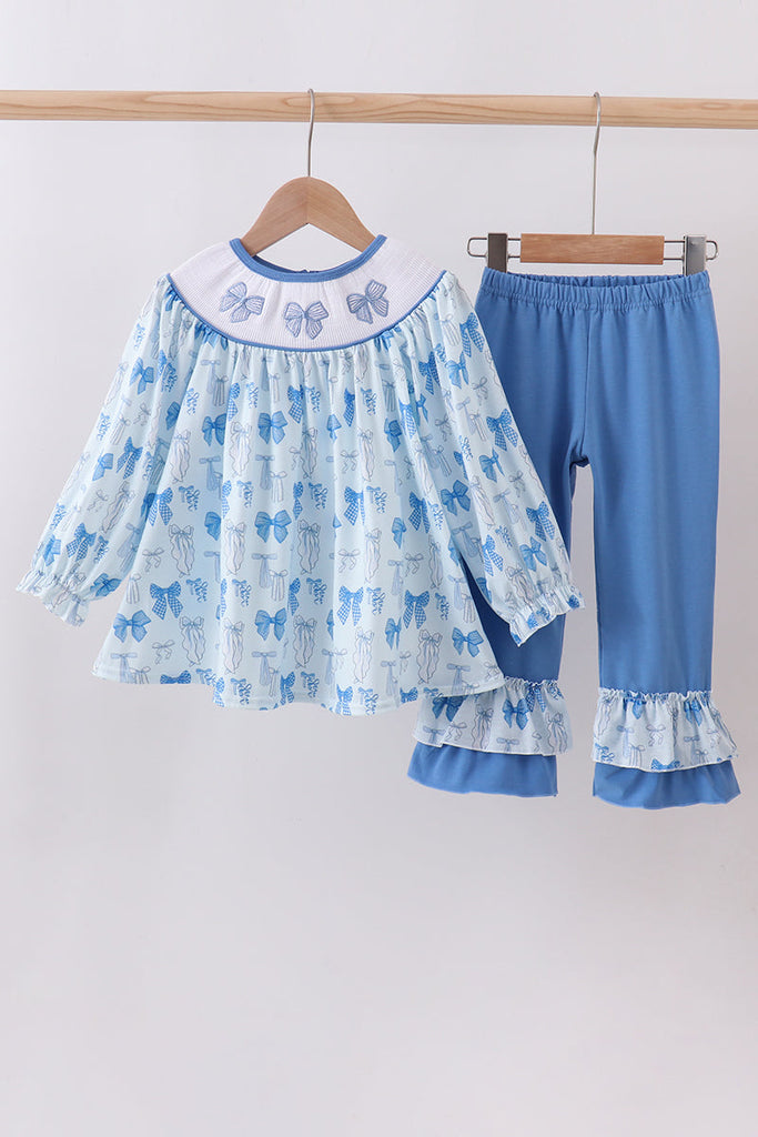 Blue bow smocked ruffle pants set