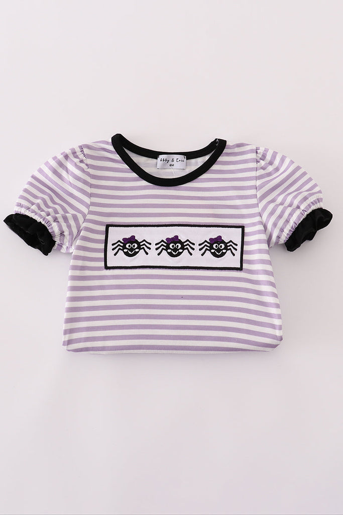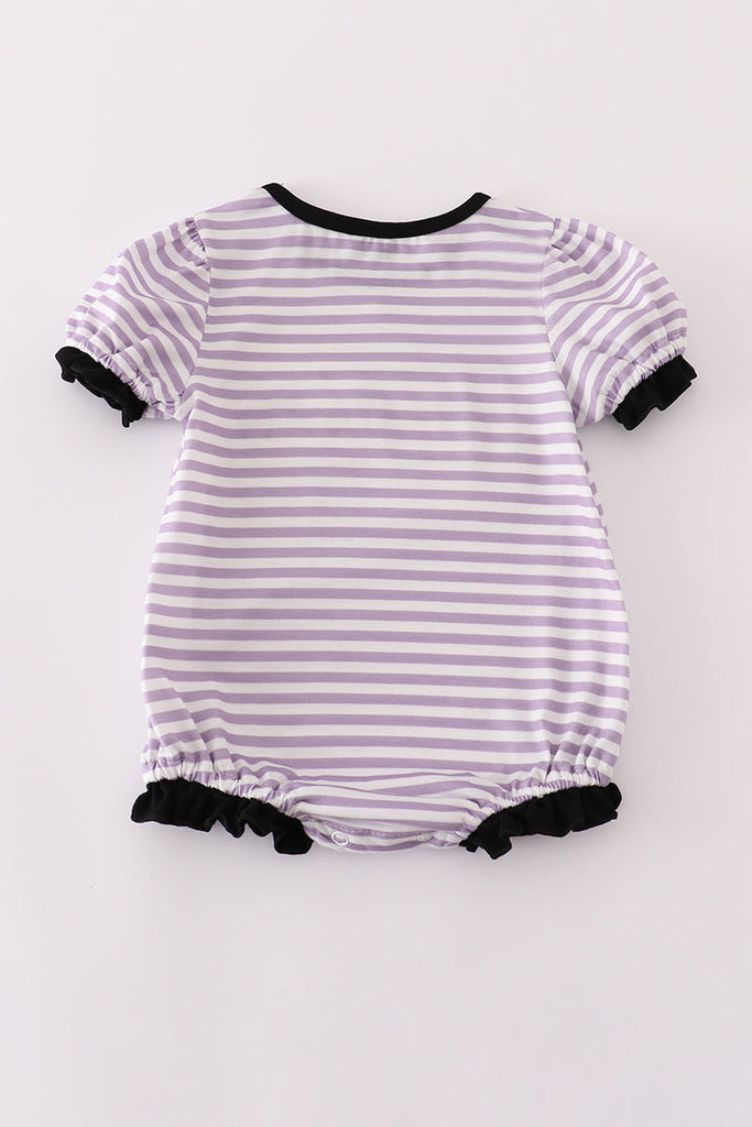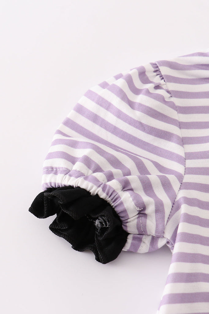 Celebrate Halloween in style with this playful purple bubble dress featuring charming spider embroidery, bold stripes, and flirty ruffle details. Perfect for adding a fun, festive touch to your wardrobe while keeping comfort and whimsy in mind.