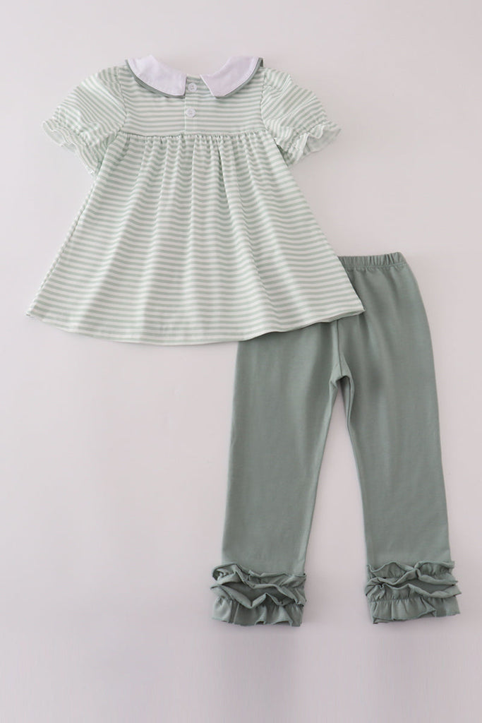 Sage stripe french knot ruffle pants set