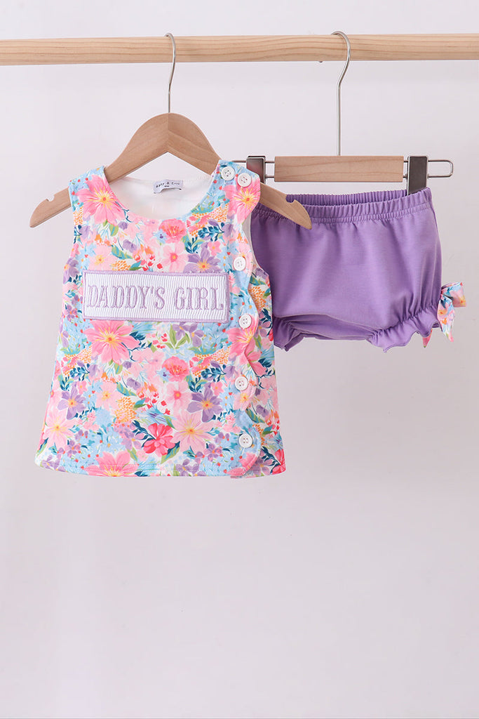 Daddy's little girl will love this adorable purple floral bloomer set! Featuring delicate smocked detailing and charming ruffled edges, this two-piece ensemble combines comfort with undeniable cuteness. The soft, breathable fabric keeps her cool and happy all day long, while the playful design makes getting dressed fun. Perfect for playdates, family photos, or everyday wear—this set is sure to become a favorite in her wardrobe.