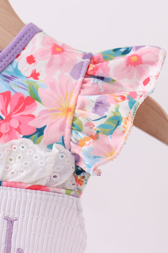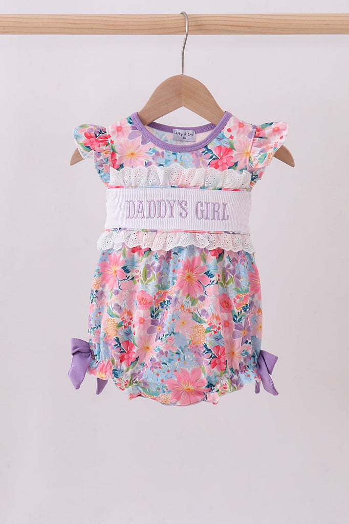 Daddy's little girl will love this adorable purple floral bubble! Featuring delicate smocking details and charming ruffles, this playful piece combines comfort with style. The soft, breathable fabric keeps her cool while the cheerful floral print adds a pop of personality to any outfit. Perfect for playdates, family gatherings, or everyday wear—it's the sweet, sassy look every daddy's girl deserves!