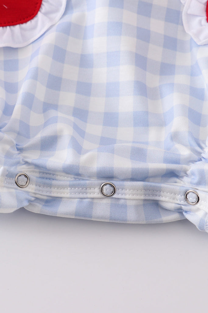 "Score a fashion home run with our blue plaid baseball embroidery girl bubble! This adorable outfit combines sporty style with sweet charm. Perfect for your little fashionista, it's a grand slam!"