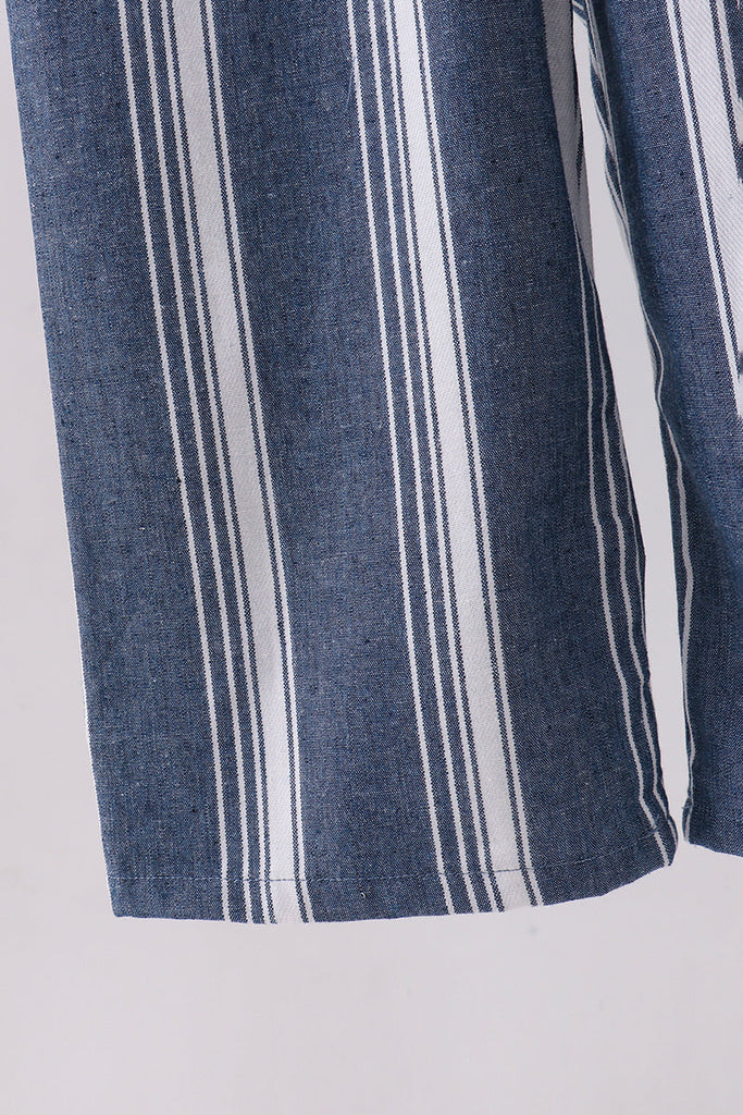 Effortless elegance meets comfort in this navy stripe linen jumpsuit. Crafted from breathable linen, it features classic navy stripes for a timeless look that transitions seamlessly from casual days to evening outings. The relaxed fit flatters all body types while the full-length silhouette creates a polished, put-together appearance. Perfect for warm weather styling—dress it up with heels or keep it casual with sneakers. A versatile wardrobe essential that works as hard as you do.