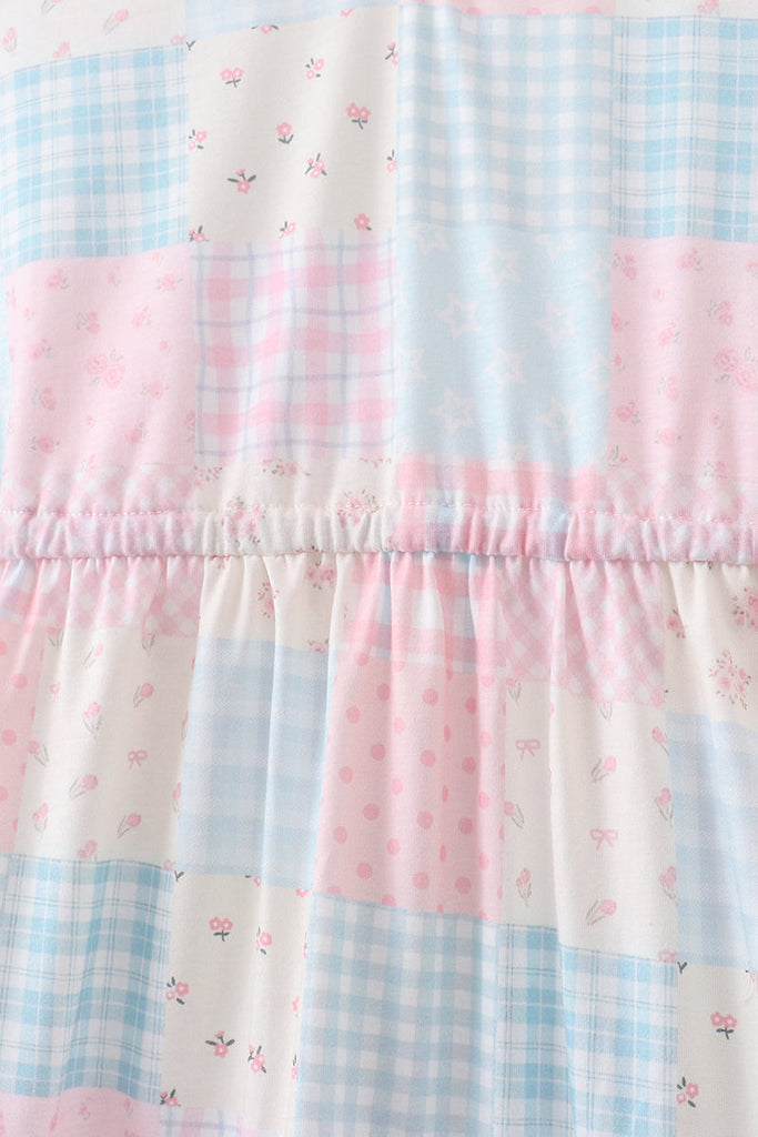 Embrace effortless charm with this pink patchwork floral tiered dress. Featuring a delightful mix of floral prints in soft pink tones, the layered silhouette creates beautiful movement and dimension. The patchwork design adds a playful, artisanal touch that stands out from the ordinary. Perfect for casual outings, garden parties, or weekend adventures, this dress combines comfort with eye-catching style. A versatile piece that transitions seamlessly from day to night.