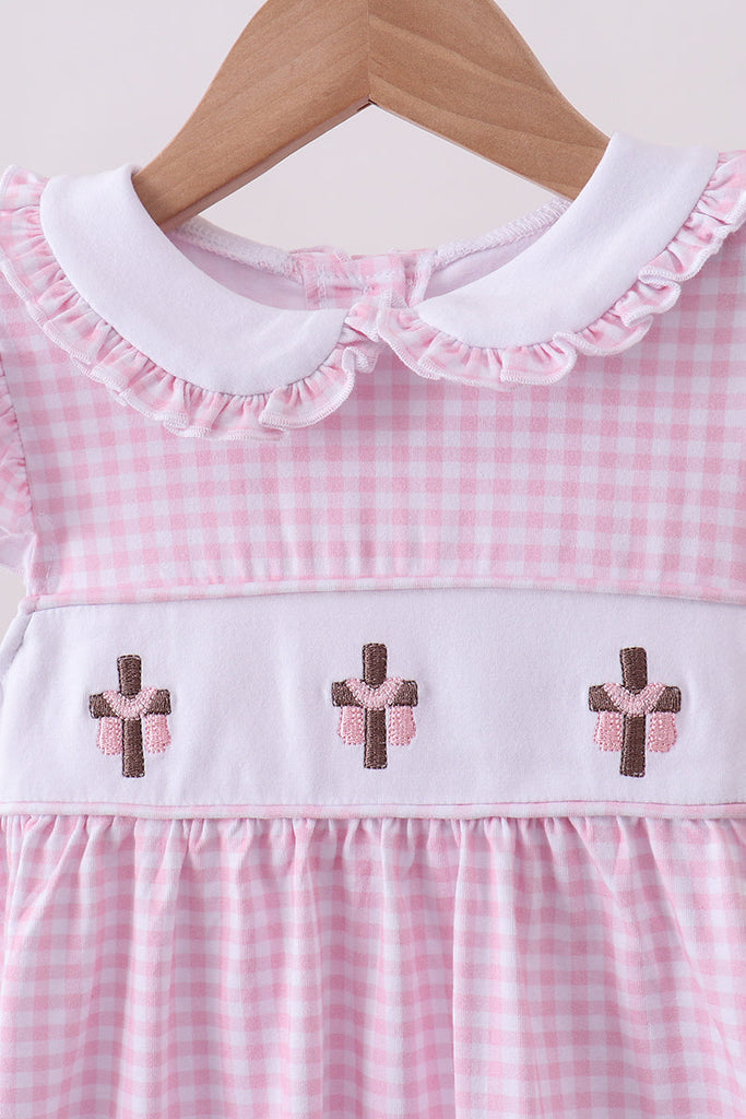Charming pink gingham dress featuring delicate cross embroidery details and playful ruffle accents throughout. The classic gingham pattern pairs beautifully with intricate embroidered crosses for a sweet, vintage-inspired look. Perfect for casual outings, special occasions, or adding a touch of whimsy to your everyday wardrobe. Soft, comfortable fabric ensures all-day wearability while the ruffled design creates movement and dimension.